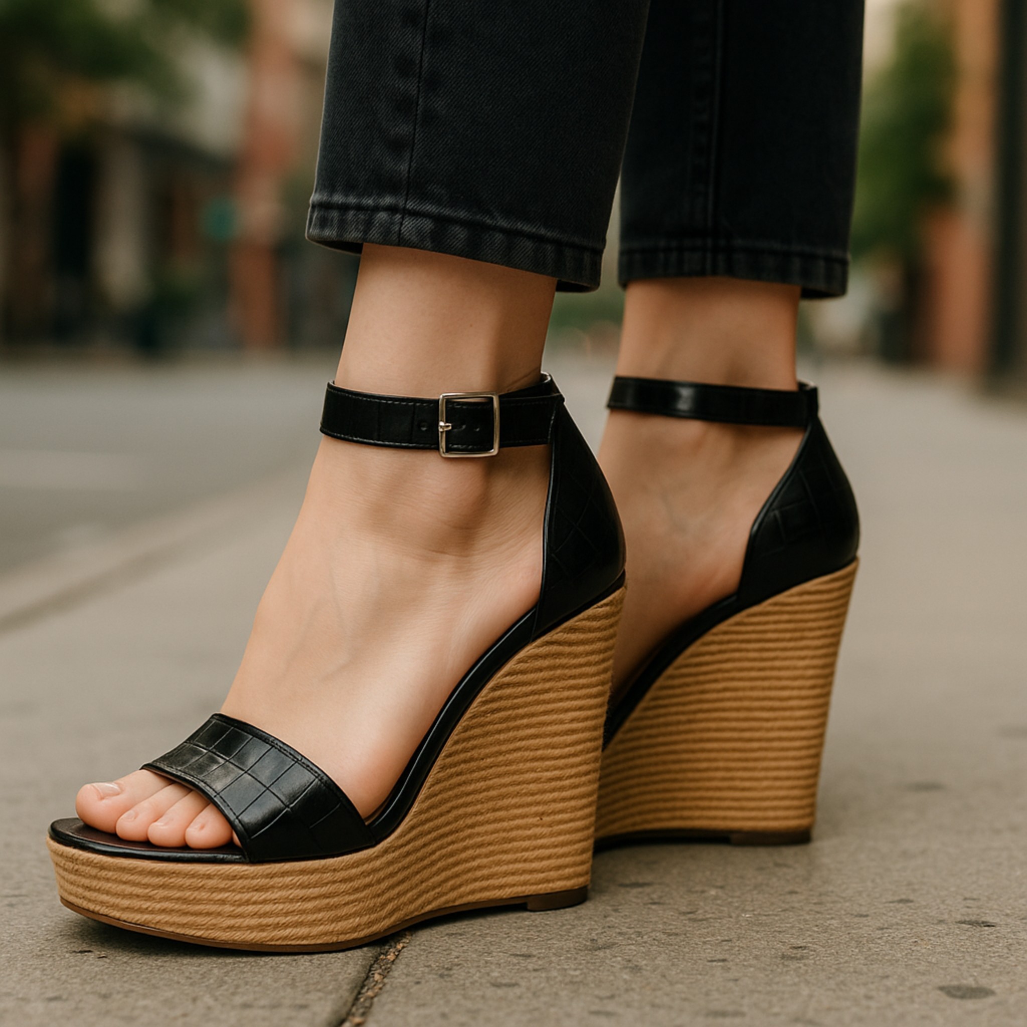 Chaussures Femme, Mules à talon compassé, lanières en simili cuir, noir