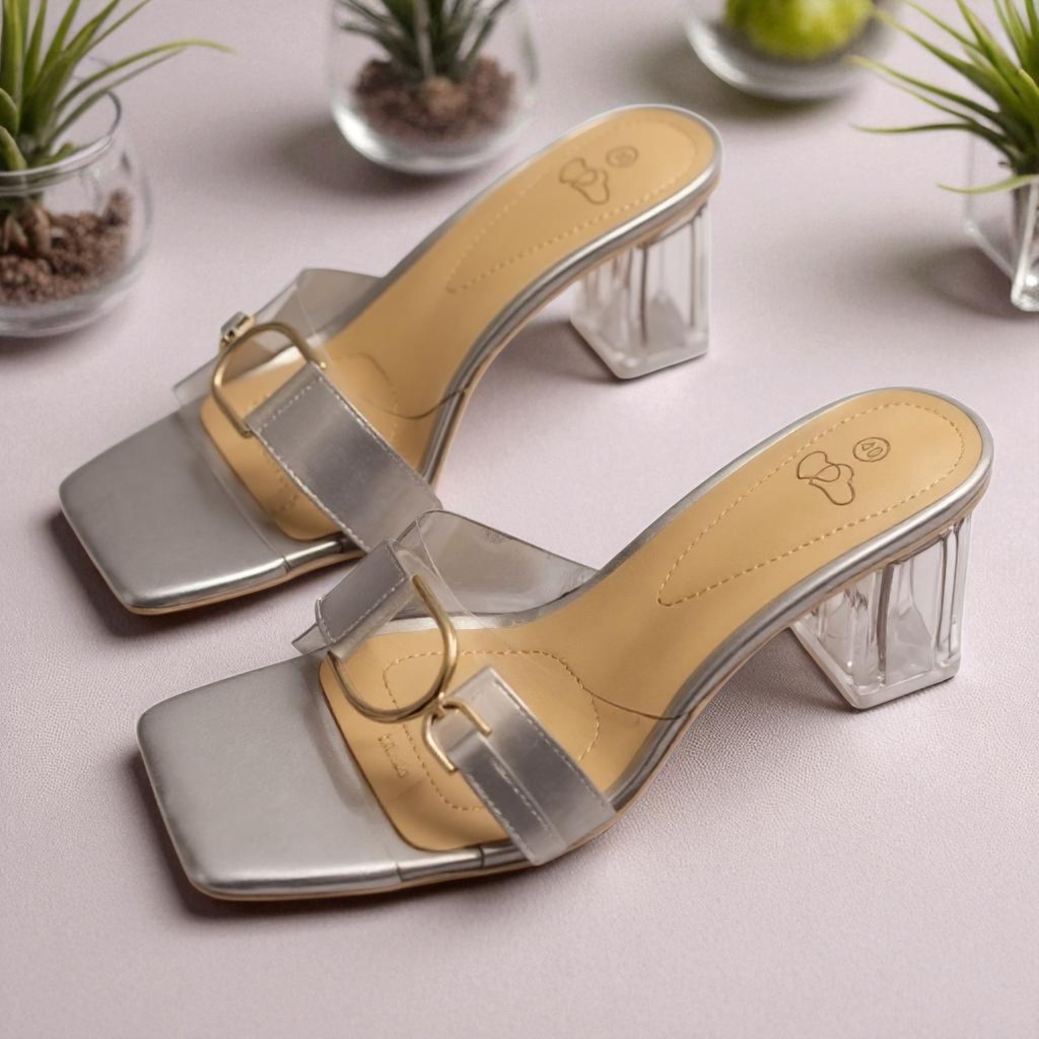 Chaussures Femme, mules Femme, lanière en plexi, talon transparent, gris