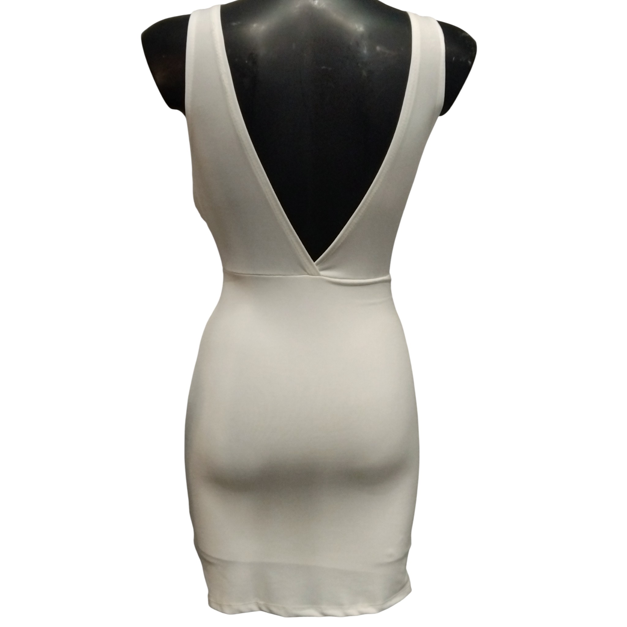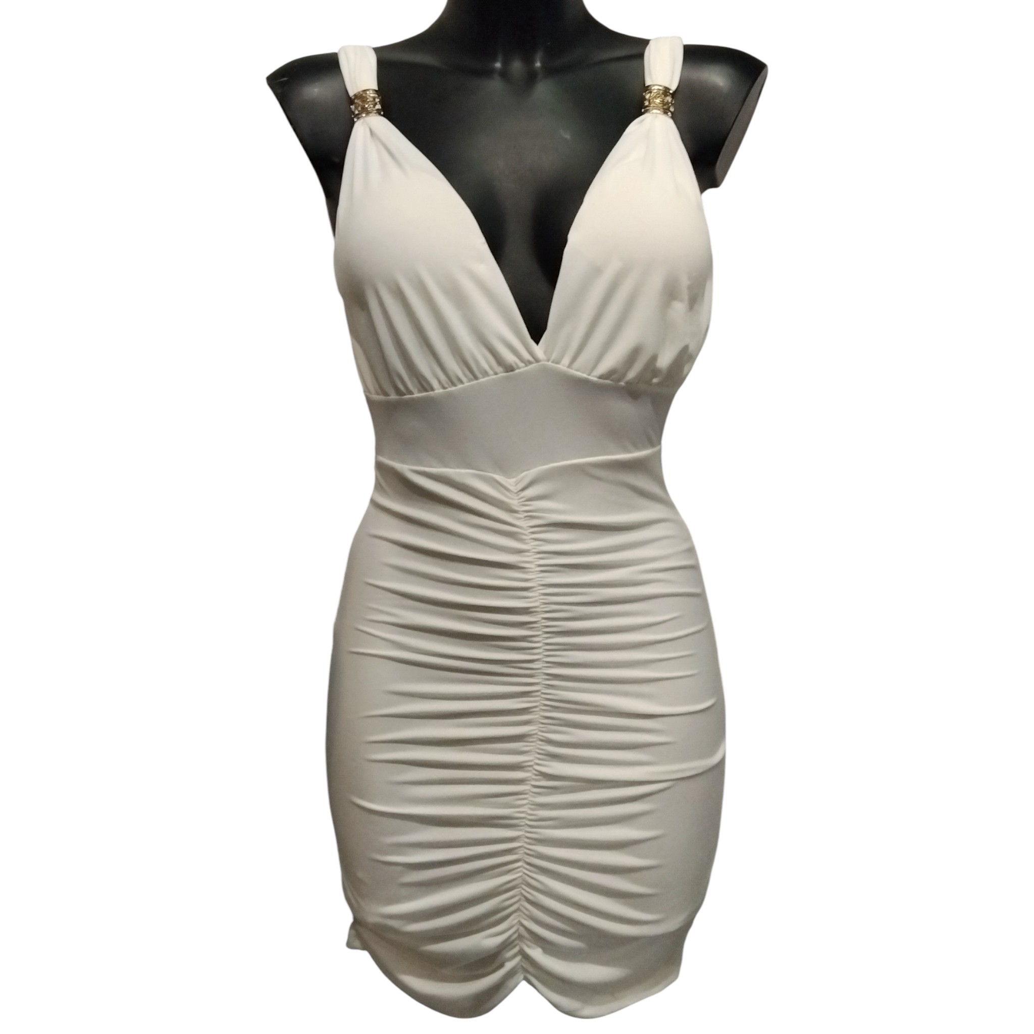Robe de soirée, robe courte, sexy, décolleté plongeant, bijoux aux bretelles, blanc