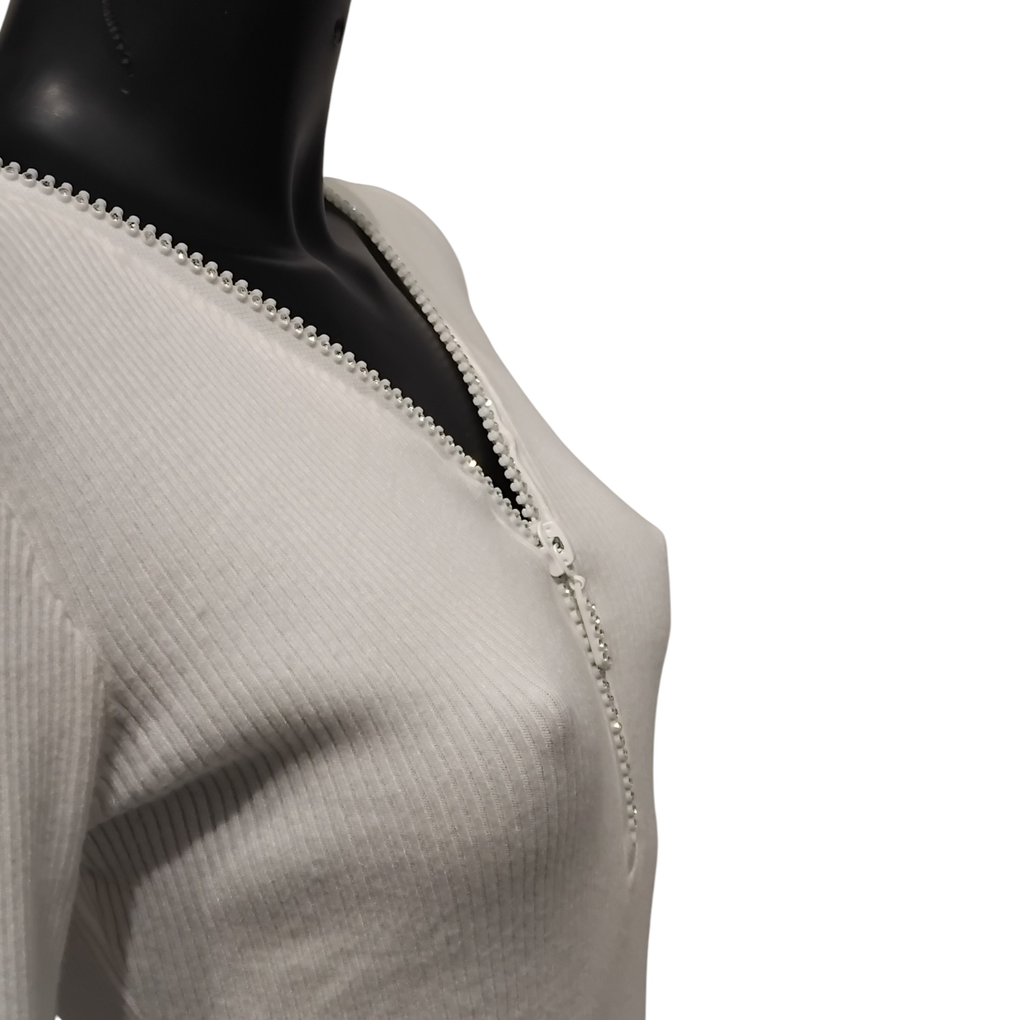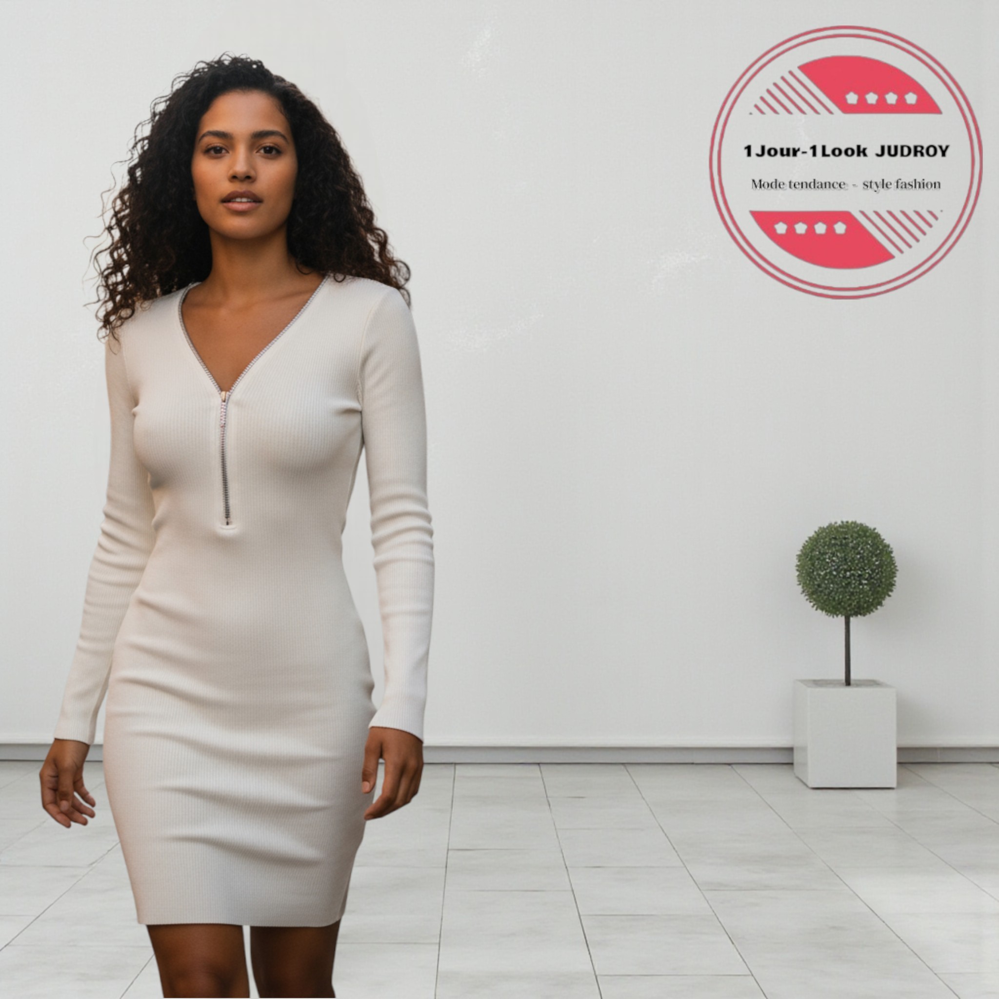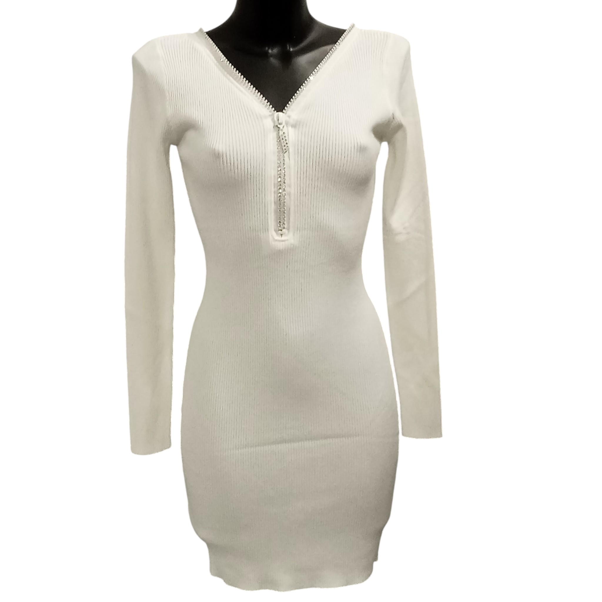 Robe de soirée, robe-pull, coupe moulante, ouverture à zip et strass, blanc